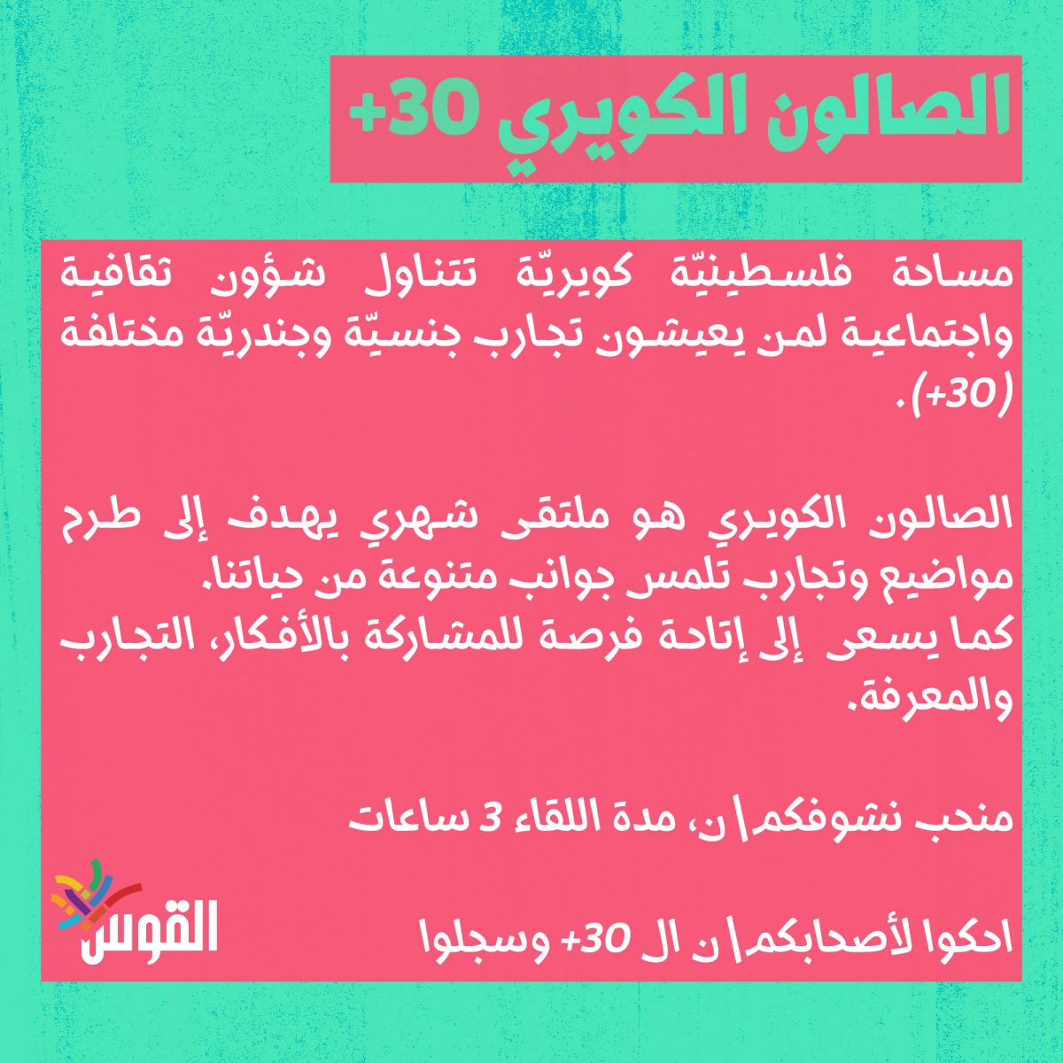 الصالون الكويري - هو مساحة فلسطينيّة كويريّة تتناول شؤون ثقافية واجتماعية لمن يعيشون تجارب جنسيّة وجندريّة مختلفة (30+).